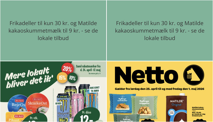 Netto tilbyder Matilde kakaoskummetmælk til en skarp pris på kun 9 kr. for 1 liter. Der er en begrænsning på 10 stk. pr. kunde pr. dag. Tilbuddet gælder fra lørdag den 25. april til fredag den 1. maj.