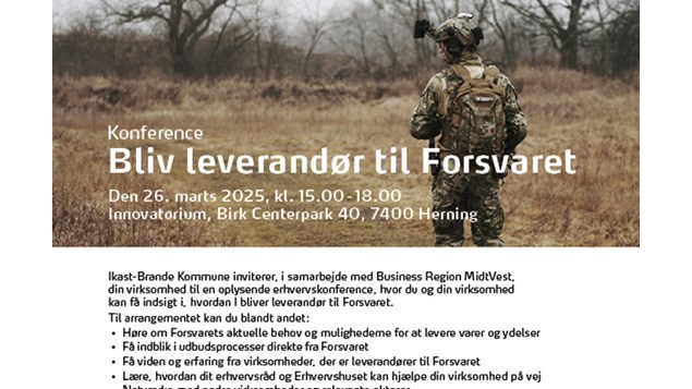 Ikast-Brande Kommune, i samarbejde med Business Region MidtVest, arrangerer en erhvervskonference, der henvender sig til de midtjyske virksomheder, der ønsker at byde ind på det lukrative nye marked for militært udstyr. Danmark planlægger at investere milliarder af kroner i indkøb af militært udstyr i de kommende år, og det åbner op for muligheder for lokale virksomheder.