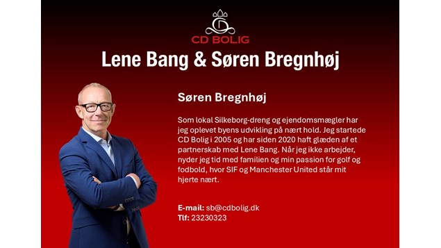 Søren er lokal Silkeborg-dreng og har været en del af CD Bolig siden 2005. Med passion for ejendomsmæglerfaget, partnerskab med Lene Bang – og en stor kærlighed til både golf, fodbold, SIF og Manchester United